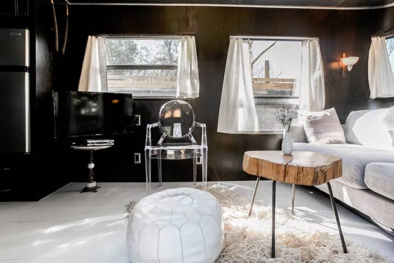 This remodeled 1955 Spartan Mansion camper proves that you can still live in luxury even in a smaller space. Its sleek, modern interior feels much closer to a high-end hotel rather than the inside of a trailer, and there are a number of unique touches like a vintage record player and outdoor shower (in addition to a tub and shower inside). With its queen bed and sofa bed, up to four guests can enjoy their stay here — just don’t be surprised if the surprising chic interior decor inspires you to go home and repaint your whole house black.